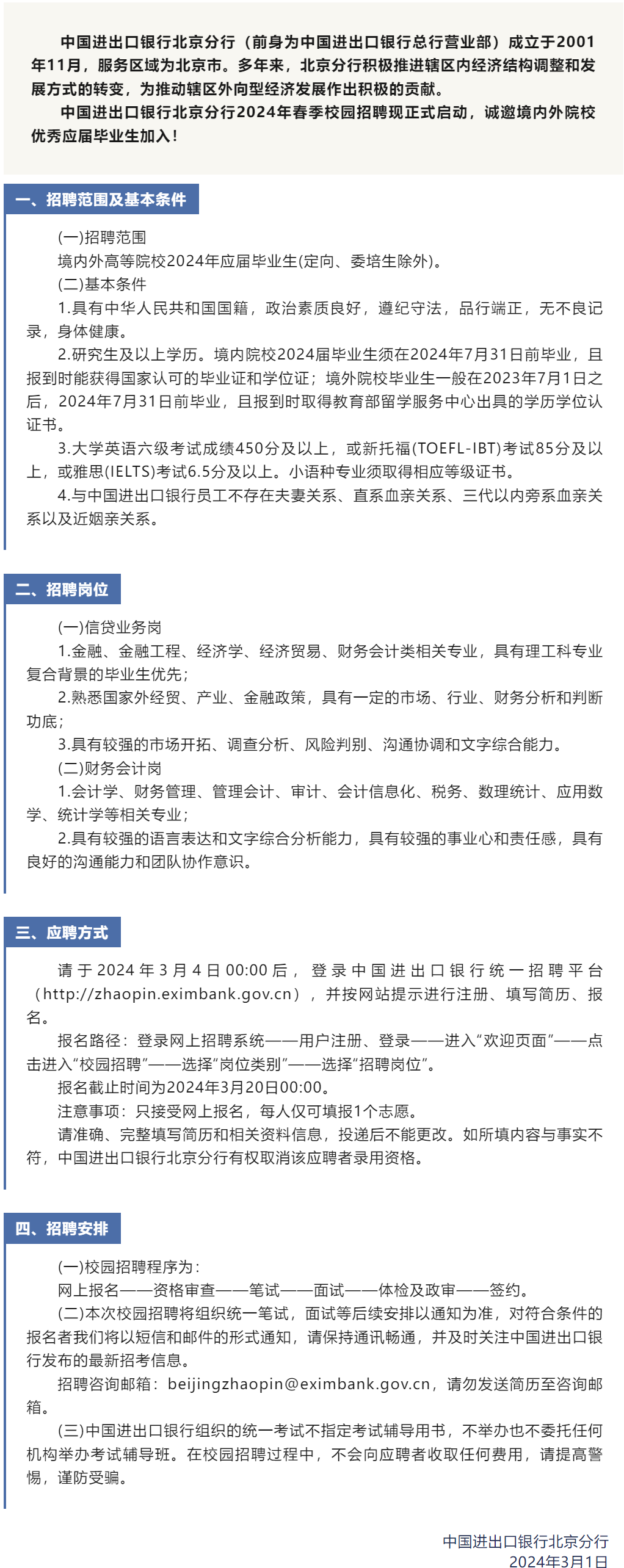 校招 | 中国进出口银行北京分行2024年春季校园招聘公告